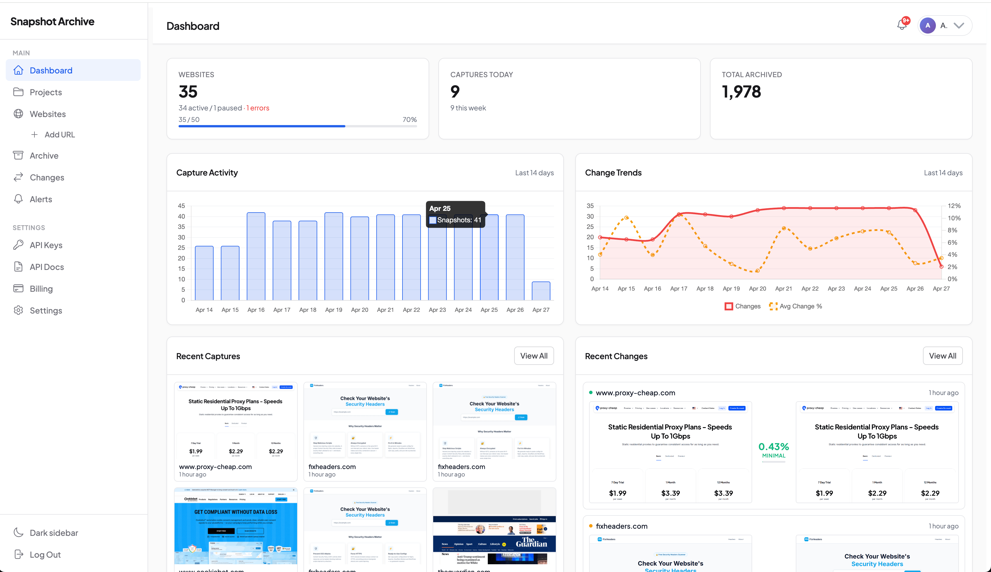 This is the part that matters for legal evidence and compliance archiving. When a regulator or a lawyer needs to see what a page looked like on a specific date and what changed since, what they need is the diff history — not just the screenshot, but the documented sequence of changes around it.